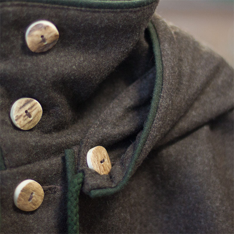 Cleaning is possible but often unnecessary. Simply air the garment for a few hours, then lightly brush it, and it will usually be “clean” again. If absolutely necessary, loden can be hand-washed in lukewarm water, gently squeezed, and left to dry naturally. Wool is naturally self-cleaning, especially when exposed to oxygen or fresh air. Rain is also ideal for natural cleaning.